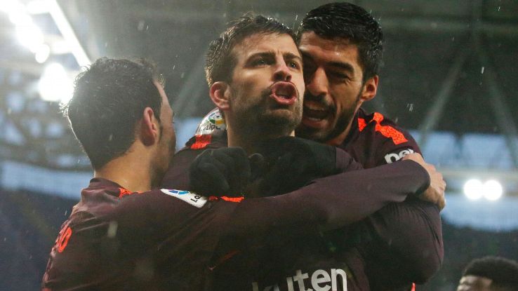 Barcelona came from behind with Gerard Pique's late goal salvaging a 1-1 draw against Espanyol on Sunday, in a spiky Catalan derby on a waterlogged pitch in Cornella.